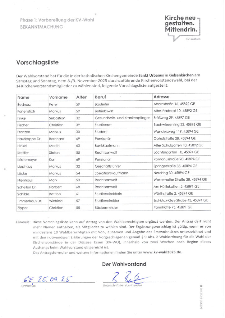 Der Wahlvorstand hat für die Kirchenvorstandswahl am 8./9. November 2025 die vorläufige Liste der Kandidierenden aufgestellt. Diese Vorschlagsliste hängt in den Kirchen der Pfarrei aus und kann auf der Internetseite der Pfarrei eingesehen werden.
