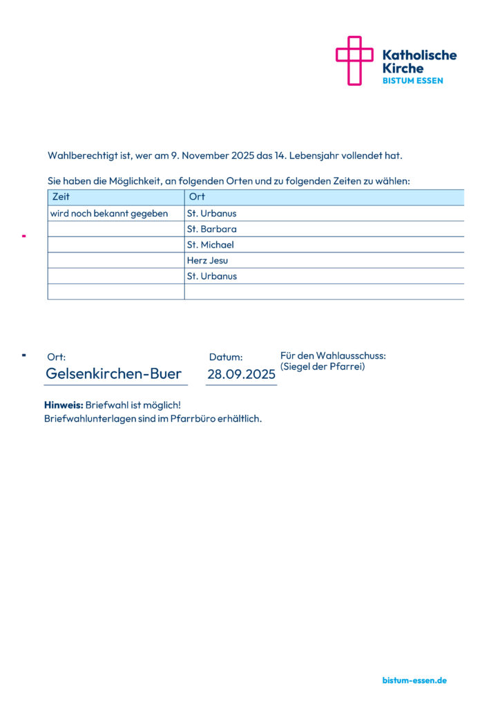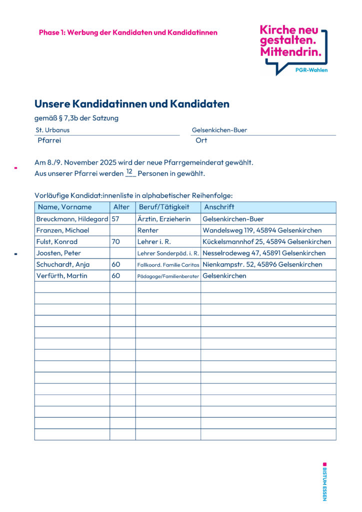 Am 8. und 9. November 2025 wird der Pfarrgemeinderat neu gewählt. In unserer Pfarrei werden 12 Personen gewählt. Hier veröffentlichen wir die vorläufige Kandidierendenliste in alphabetischer Reihenfolge: