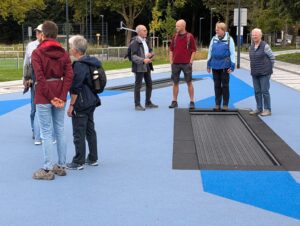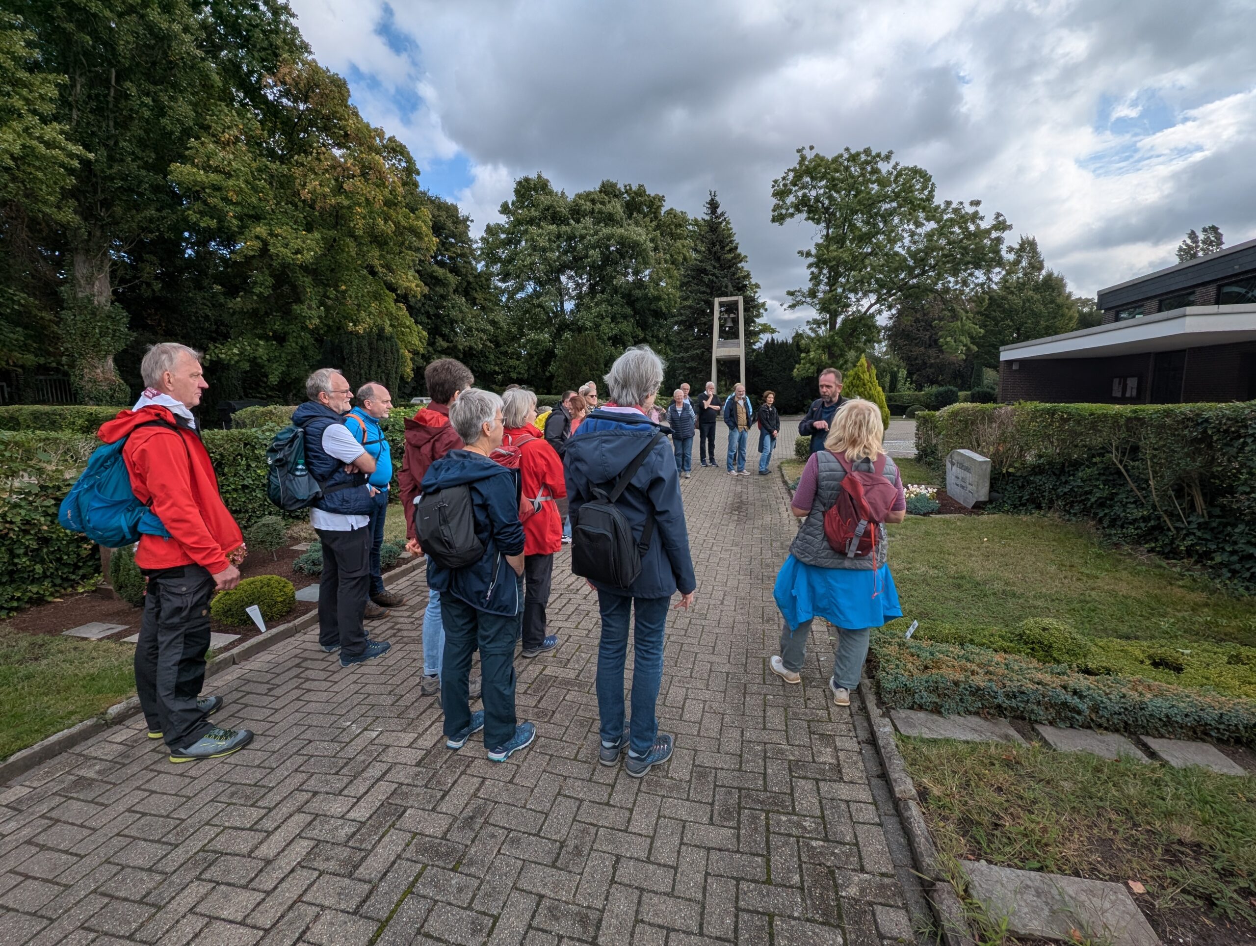 Nachdem es zuvor noch leicht geregnet hatte, machten wir uns nun bei trockenem Wetter auf. Wir kamen an der Glückaufkampfbahn mit der neu gestalteten Sportfläche und dem Friedhof in Schalke vorbei. Auf dem Friedhof besuchten wir die Gräber von Ernst Kuzorra und Fritz Szepan.