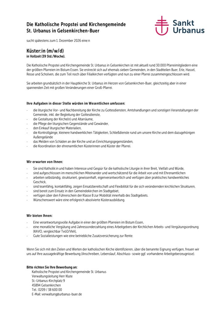 Wir suchen spätestens zum 01.12.2026 eine:n Küster:in für Sankt Urbanus (m/w/d) in Vollzeit.