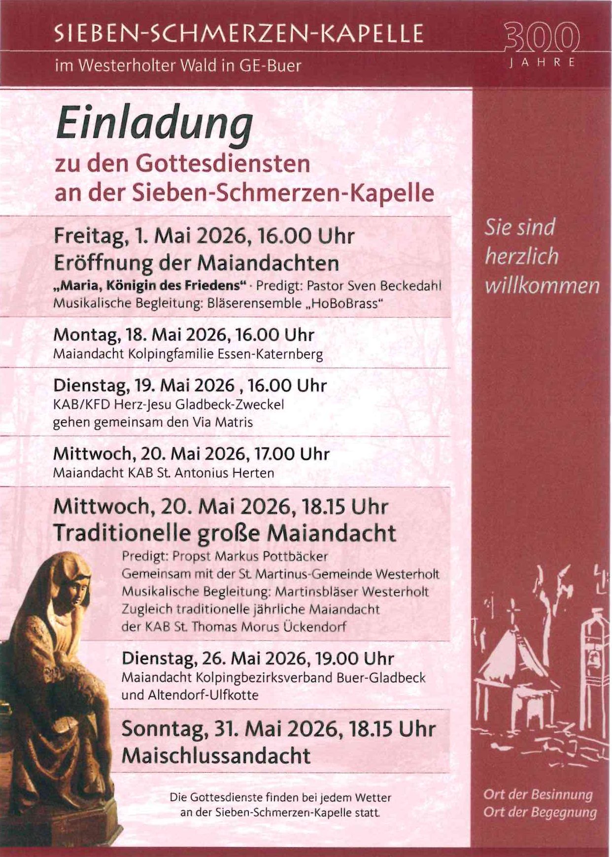 Den ganzen Monat Mai über finden regelmäßig Andachten an der Kapelle im Westerholter Wald statt. Zur Teilnahme laden wir herzlich ein.